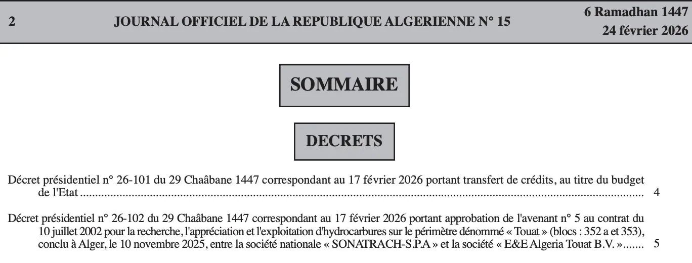Un nouveau chapitre s’ouvre pour le champ gazier de Touat à Adrar. Un décret présidentiel, daté du 17 février 2026 et publié au Journal officiel, entérine une modification contractuelle qui se traduit, dans les faits, par le retrait du groupe français Engie du projet.