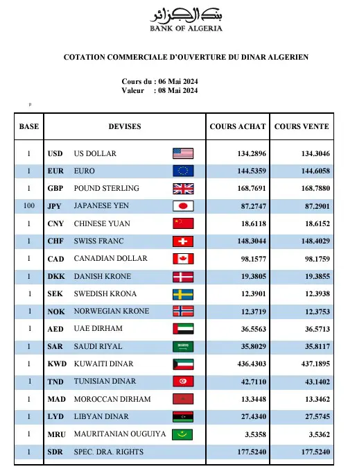 Les dernières données émanant de la Banque d’Algérie, couvrant la période allant du 6 au 8 mai 2024, offrent un aperçu des taux de change qui règnent sur le marché financier officiel, tandis que le marché informel poursuit son propre rythme, accentuant davantage les disparités entre ces deux sphères monétaires.