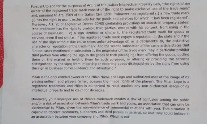 Selon un document qui circule sur les réseaux sociaux, qui en date du 20 mars 2023, émanant de l’AC Milan, ce dernier aurait demandé d’enlever le logo et l’emblème de la pizzeria en question. Le club lombard aurait même décider de suivre toutes les voies légales pour percevoir une indemnité en raison de l’utilisation du logo et de l’emblème du club d’une manière illégale.