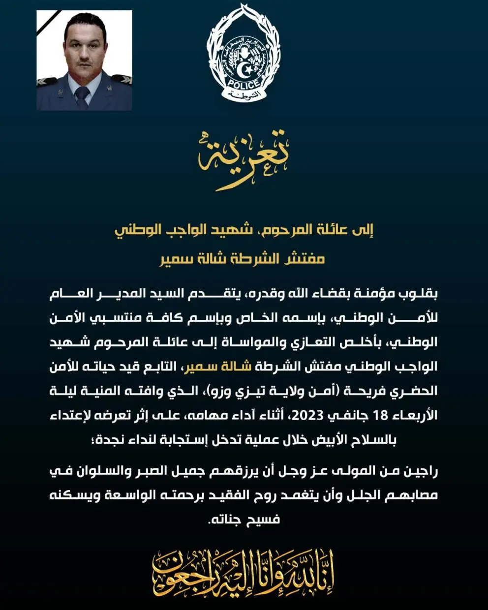 Cependant, le coupable a surpris les intervenants en poignardant mortellement Samir Chala qui a rendu l’âme sur place. Tandis que son collègue a été transporté immédiatement à l’hôpital, après avoir reçu de graves blessures. La même source a indiqué que le martyr du devoir est âgé de 46 ans, marié et père deux filles. Il habite dans la région d’Akhherban, commune de Freha.