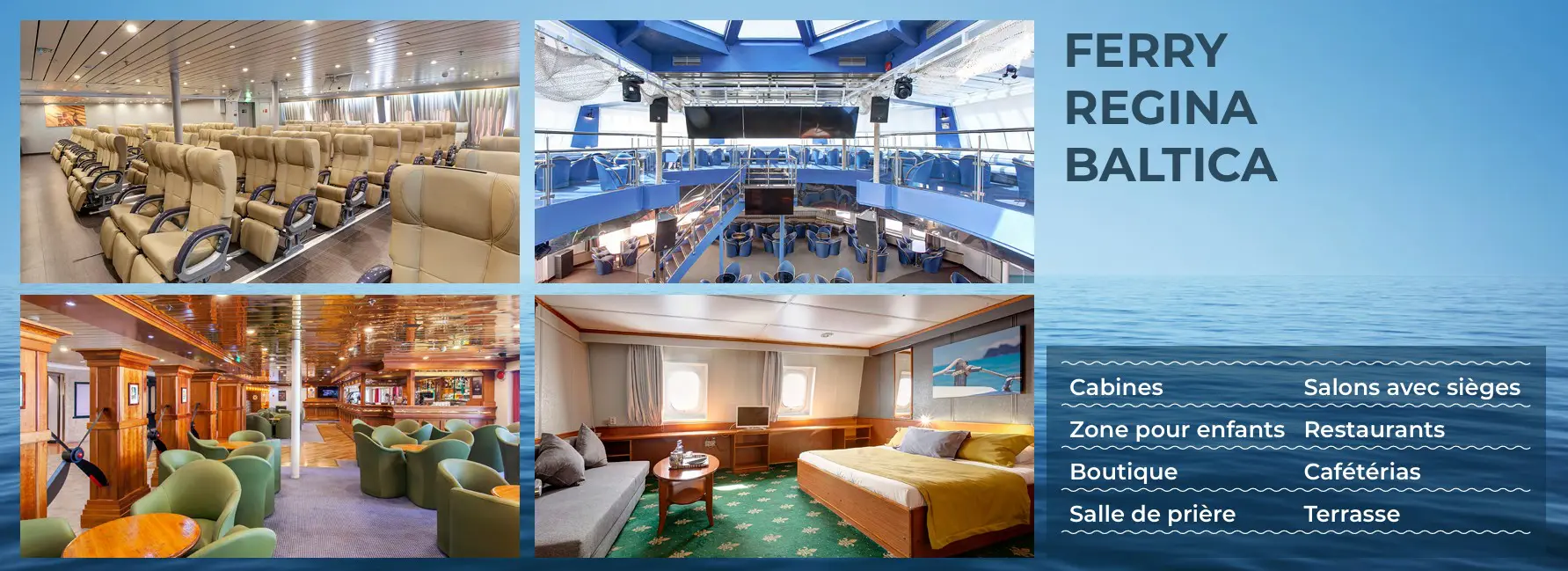 - Regina Baltica : 145 m de longueur, vitesse 19 kn avec une capacité de plus de 1 600 passagers et 350 véhicules.