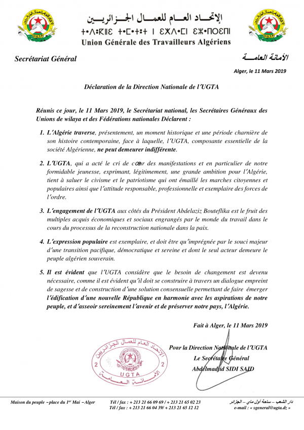 « l’UGTA, composante essentielle de la société algérienne, ne peut demeurer indifférente. L’Algérie traverse, présentement, un moment historique et une période charnière de son histoire contemporaine, face à laquelle, l’UGTA, composante essentielle de la société Algérienne, ne peut demeurer indifférente. L’UGTA, qui a acté le cri de cœur des manifestations et en particulier de notre formidable jeunesse, exprimant, légitimement, une grande ambition pour l’Algérie, tient à saluer le civisme et le patriotisme qui ont émaillé les marches citoyennes et populaires ainsi que l’attitude responsable, professionnelle et exemplaire des forces de l’ordre »