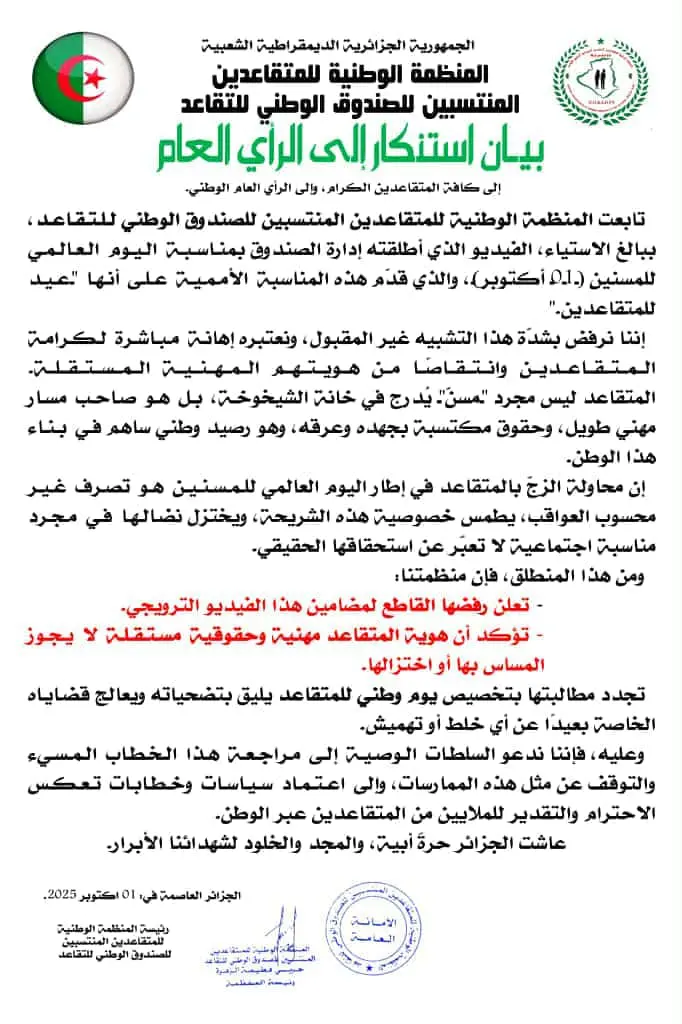 L’origine de cette controverse remonte à une vidéo « promotionnelle » publiée par la CNR (Caisse Nationale des Retraites). Le contenu de cette campagne, perçu comme une assimilation des retraités à de simples « personnes âgées », a suscité la colère de l’Organisation nationale des retraités Algériens (ONRA), pourtant affiliée à la Caisse.