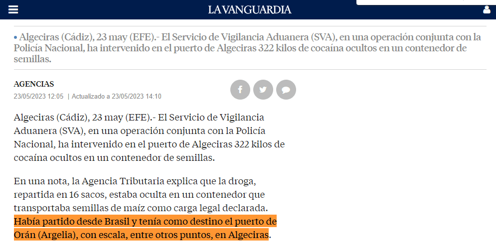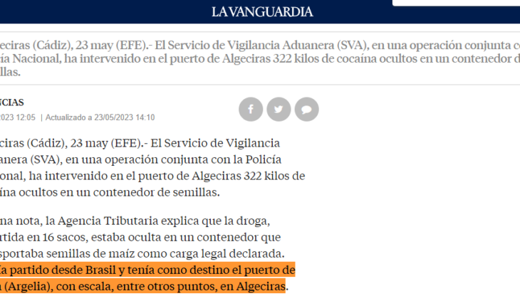 D’après l’information de La Vanguardia, plus de 300 kg de cocaïne cachés dans un conteneur transportant des grains de mais ont été découverts par une brigade de douane espagnole au port d’Algésiras. La cargaison, en provenance du Brésil, a fait escale dans la ville espagnole et devait reprendre son trajet quelques jours plus tard jusqu’à sa destination finale : le port d’Oran.