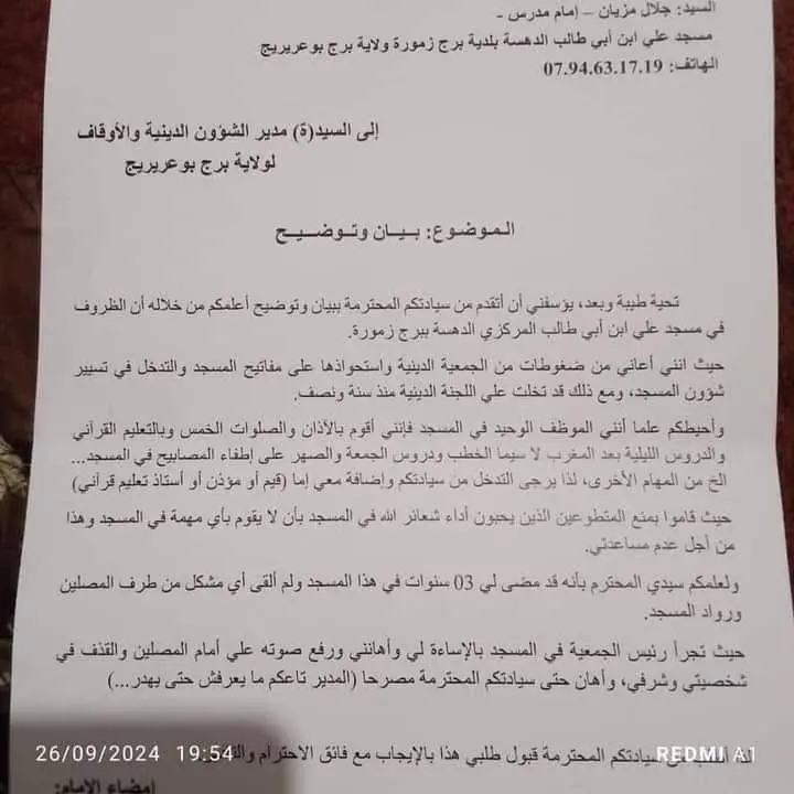 M. Meziane avait récemment adressé une lettre au directeur des affaires religieuses et des wakfs de la wilaya de Bordj Bou Arreridj, dans laquelle il dénonçait des pratiques qu’il jugeait injustes.