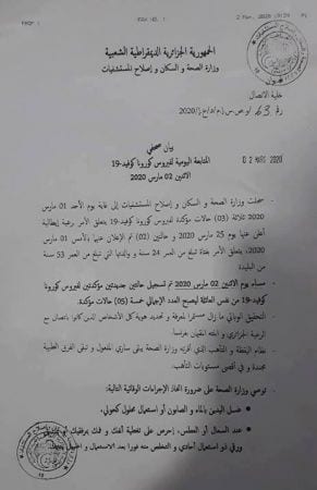Deux nouveaux cas confirmés du coronavirus ont été découverts, portant le nombre de cas confirmés à 5, selon le directeur du service des maladies infectieuses de l’hôpital Boufarik .