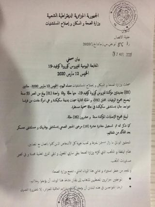Le ministère de la santé a fait état de deux nouveaux cas de contamination, portant le nombre total à 26 en Algérie, parmi les deux nouveaux cas, une femme originaire de la wilaya de Skikda.