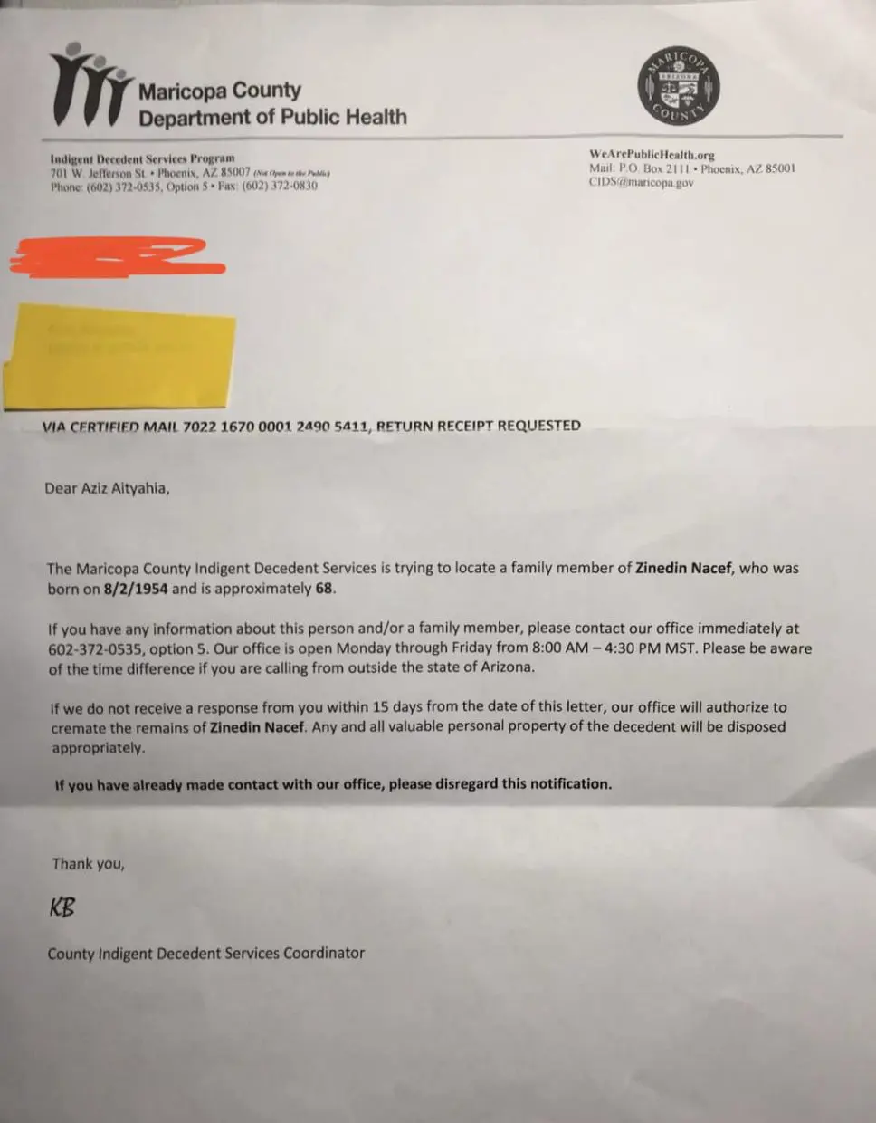 En outre, Adel a joint à son message une lettre émanant du Département de Santé Publique du Comté de Maricopa en Arizona (USA). D’après ce document, le défunt « Zinedin Nacef est né en le 8/2/1954 et devait avoir, approximativement, 68 ans ».