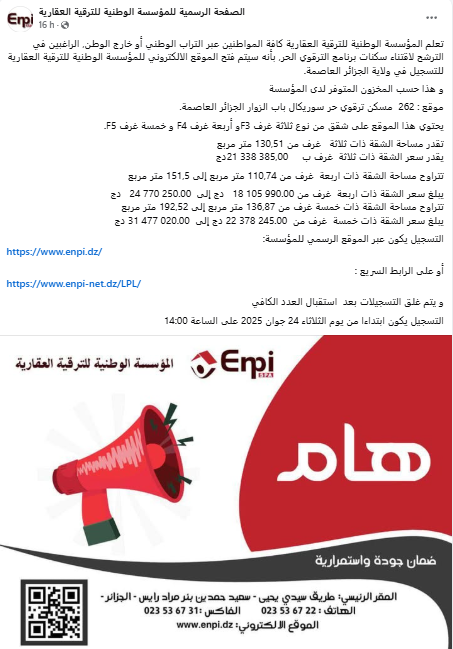 Cette opportunité s’adresse aux citoyens résidant en Algérie et à l’étranger, désireux d’acquérir un bien immobilier dans le cadre de cette formule. Les inscriptions débutent ce mardi 24 juin 2025, à partir de 14h00.