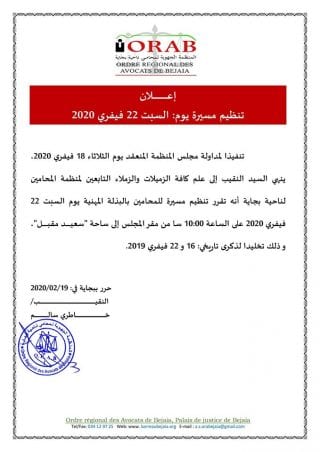 En effet, les avocats ont répondu favorables à l’appel lancé par L’Ordre Régional des Avocats de Bejaia, lors du conseil de l’Ordre tenu le 18 février passé.