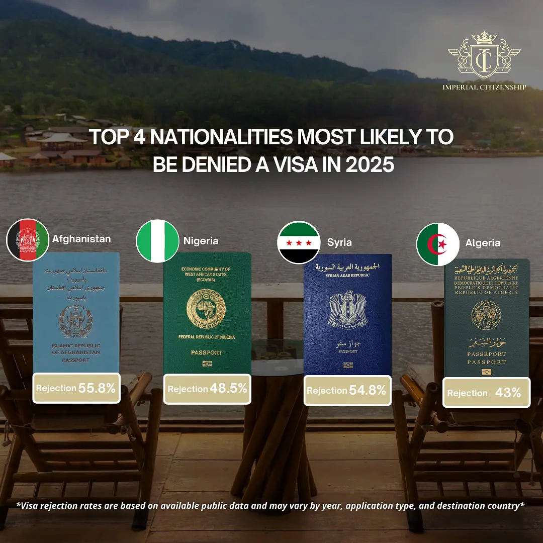 Dans un monde où le passeport devrait être un simple document d’identité pour voyager, il devient malheureusement un outil de tri, voire d’exclusion. Imperial Citizenship a publié récemment les taux de rejet de visa pour les quatre nationalités les plus touchées. Ces taux se basent sur des données publiques disponibles et peuvent varier selon l’année, le type de demande et le pays de destination. Selon ces chiffres, l’Algérie figure à la 4ᵉ place mondiale des nationalités les plus souvent confrontées au refus de visa, avec un taux de rejet atteignant 43 %.