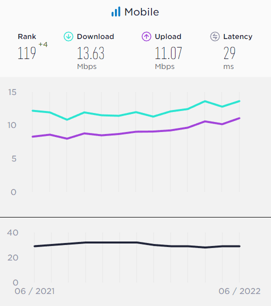 Le rapport de Dataportal, compilant les chiffres du Speedtest Global Index d’Ookla, indique que, lors du premier semestre de l’année 2022, la vitesse de connexion à l’Internet mobile en Algérie a atteint 13,63 Mb/s (mégabits par seconde). Cela représente une augmentation de 3,58 Mb/s (+35,6 %) par rapport à 2021.