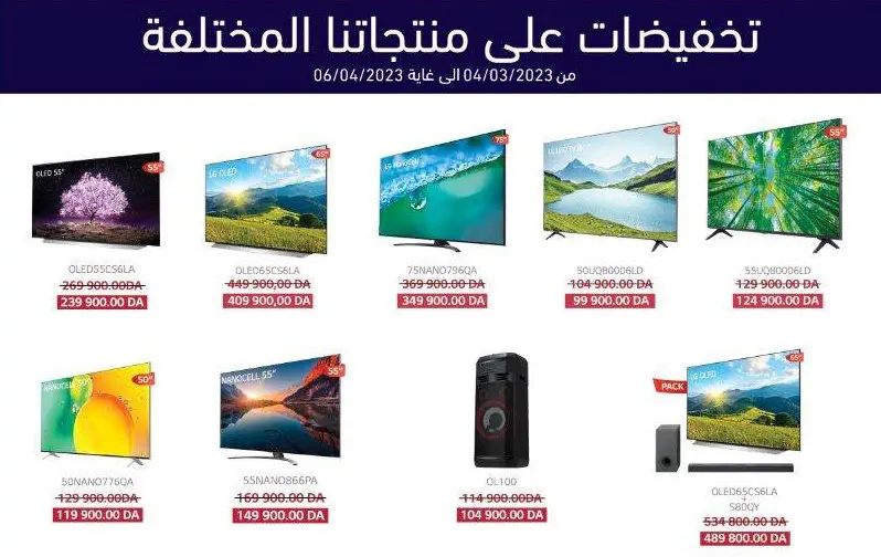 Ainsi, vous pouvez profiter de cette occasion pour vous offrir le téléviseur LG OLED 55 pouces, avec sa qualité 4K aux innombrables détails, et dont le prix passe de 269 900 DA à 239 900 DA. Ou encore, acquérir le OLED 65 pouces pour une expérience plus immersive au prix promotionnel de 409 900 DA au lieu 449 900 DA.