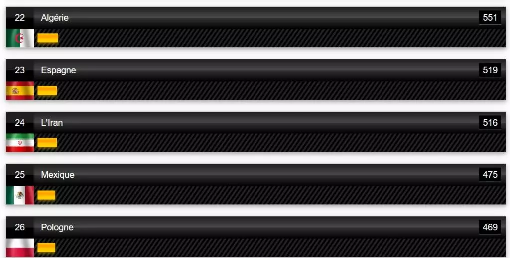 Sur le classement figurent également l’Espagne, l’Iran, le Mexique et la Pologne, qui occupent, respectivement, les 23, 24, 25 et 26ᵉ places sur le classement mondial.