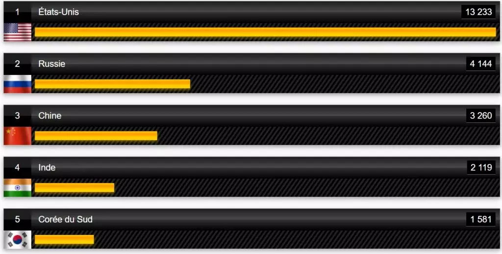 Les États-Unis occupent la tête de liste du classement mondial avec une force totale de pas moins de 13233 avions, suivies de la Russie, la Chine et l’Inde, qui possèdent, respectivement, des forces totales de 4144, 3260 et 2119 avions.