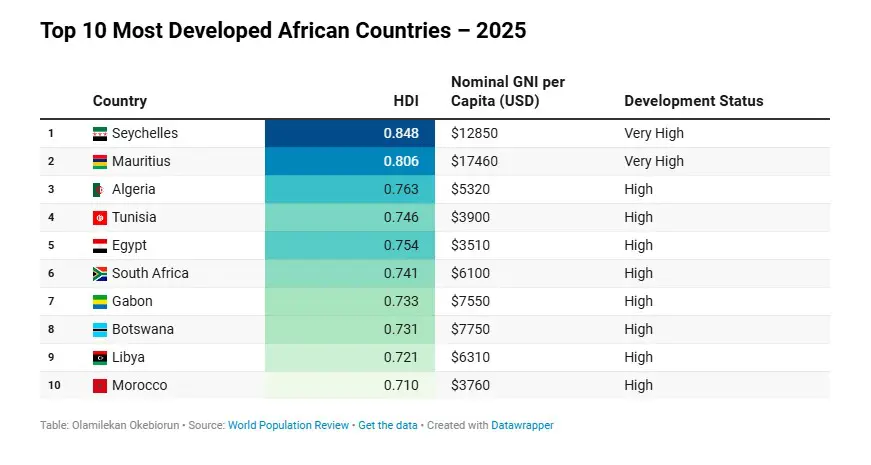 Des îles comme les Seychelles et Maurice aux économies continentales comme l’Afrique du Sud ou l’Égypte, ces pays montrent comment des politiques ciblées et des investissements stratégiques peuvent transformer le quotidien des populations et rapprocher l’Afrique des standards mondiaux de développement.