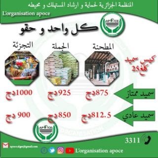Selon l’image publiée par l’organisation sur sa page officielle sur Facebook, le prix de l’excellente semoule dans le moulin est estimé à 875 dinars, et le marché de gros est estimé à 925 dinars, tandis qu’au niveau marchand il est vendu à 1000 dinars.