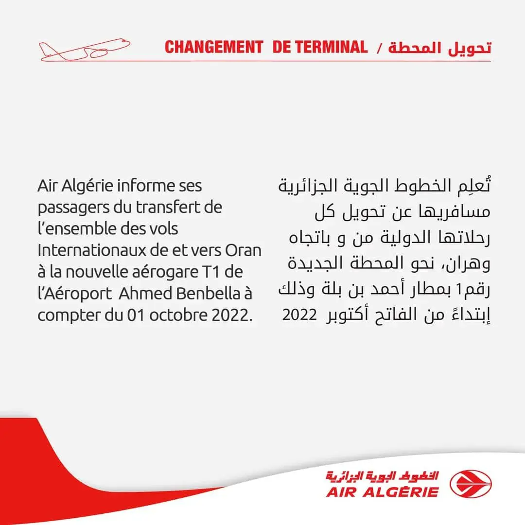 Dans un communiqué rendu public ce vendredi matin, la compagnie aérienne nationale Air Algérie a informé ses passagers du transfert de l’ensemble des vols internationaux de et vers Oran à la nouvelle aérogare T1 de l’Aéroport Ahmed Benbella. Et ce, à compter du 1er octobre 2022.