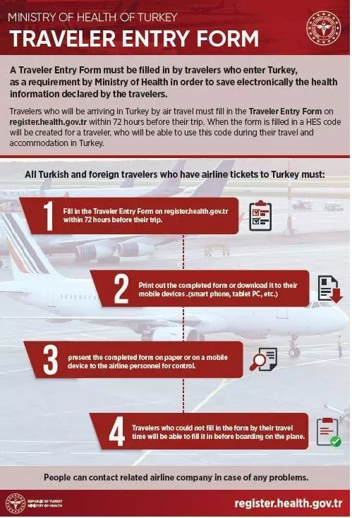 « Tous les passagers aériens âgés de 6 ans et plus se rendant en Turquie depuis l’étranger devront remplir électroniquement le « Formulaire d’entrée en Turquie », lit-on dans le communiqué de l’ambassade.