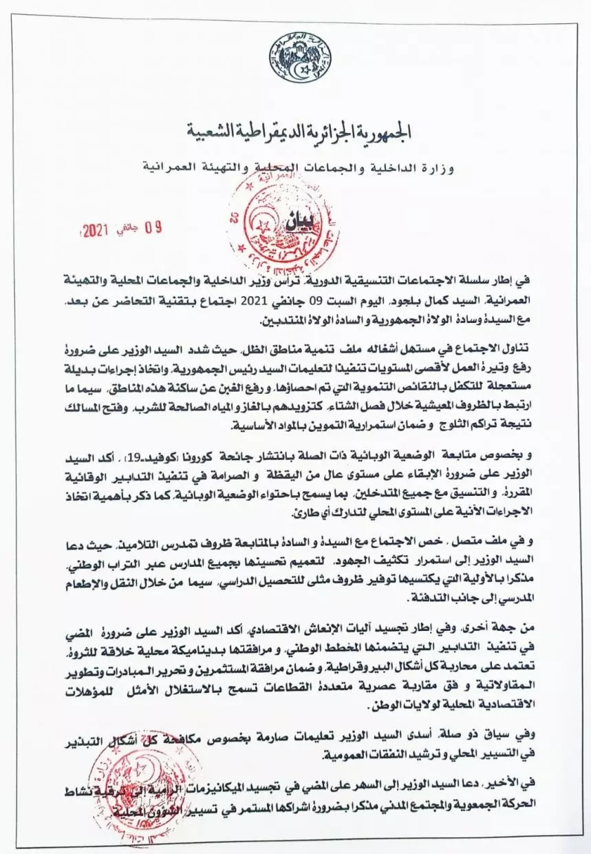 Selon un communiqué du Ministère de l’Intérieur, « le Ministre Kamel Beldjoud a présidé, ce 9 janvier, une réunion par visioconférence avec les walis et les walis délégués, qui s’inscrit dans le cadre des réunions périodiques de coordination ».